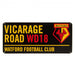 - Panneau routier Vicarage Road WD18, domicile du Watford FC sur fond noir.
